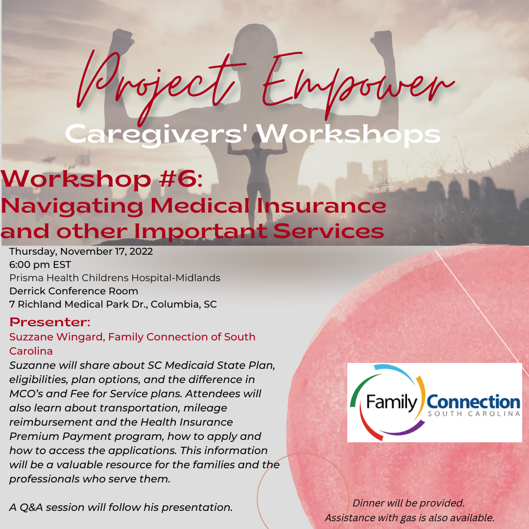 Back to All Events Project Empower Caregivers' Workshops Thursday, November 17, 2022 6:00 PM 7:00 PM Prisma Health Childrens Hospital-Midlands 7 Richland Medical Park Drive Columbia, SC, 29203 United States (map) Google Calendar ICS
